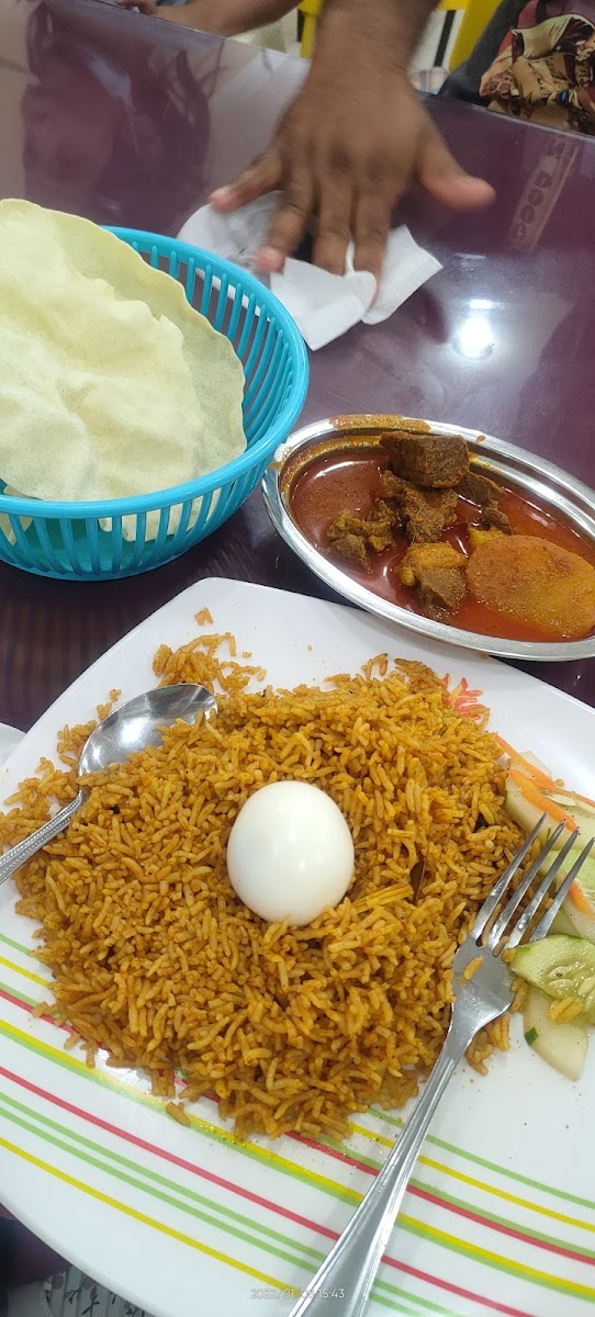 Summary- Good selection of Indian food. Famous for biriyani and lamb. Details- We had the biryani, lamb shank, fish, roti, dosai, and bitter gourd. All were good. Lamb was excellent. The waiter even brought a straw to suck the bone marrow. Great service. There an air conditioned room. Hand washing sinks are good. Toilet could be nicer. English spoken.